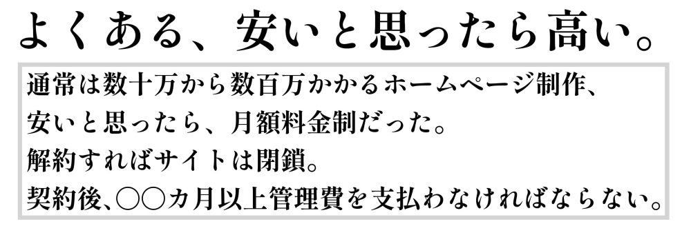 ホームページ 2025.05.24 個人事業主がホームページを用意する必要性 信頼獲得と集客力を高める鍵はホームページ!個人事業主の方は必読 この記事を読む Sozialの料金プランは 3つだけ。 見積なしで料金確認 料金をはっきり明確化 だから安心して注文できるのです。 こんなことは、ありません。 3つのナシ 最低〇〇カ月の契約→ ありません。 追加料金や月額料金→ ありません。 見積後の金額が変わる→ありません。 110,000円(税込)から、注文できます。 注文・無料相談はお気軽に。